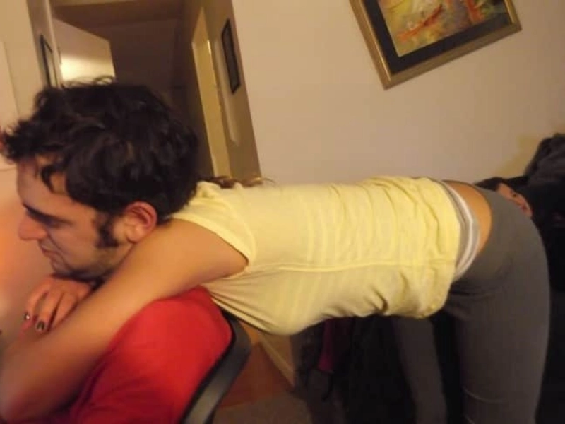 The man is seated, wearing a red shirt, while his partner lovingly wraps her arms around him. The angle generates the initial confusion, but it's actually a tender moment of affection.
