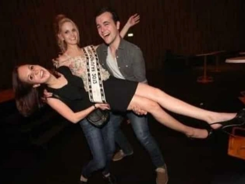 The man is carrying the woman in the black dress, while the woman in the middle is simply posing. The angle deceives the eye, transforming a simple moment into a confusing puzzle.