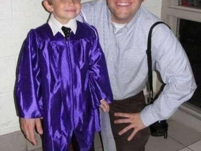 The father, kneeling in the background, has positioned his hand perfectly to generate the illusion that it's emerging from the boy's sleeve. It's a playful trick of perspective that adds humor to an already meaningful moment.