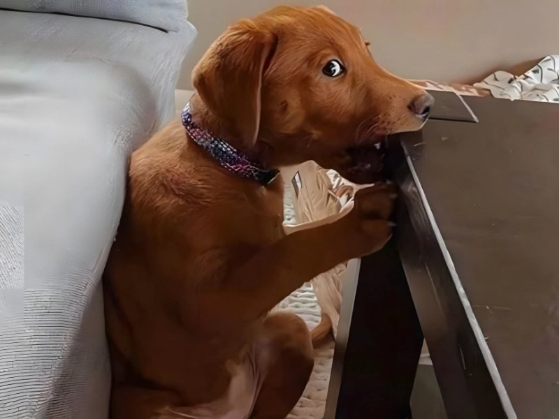 In the scene, a puppy is discovered gnawing on the edge of a table (a typical puppy behavior) while giving his owner a cunning sideways glance. His look appears to imply that the smaller brown puppy close by is the actual troublemaker, not him!