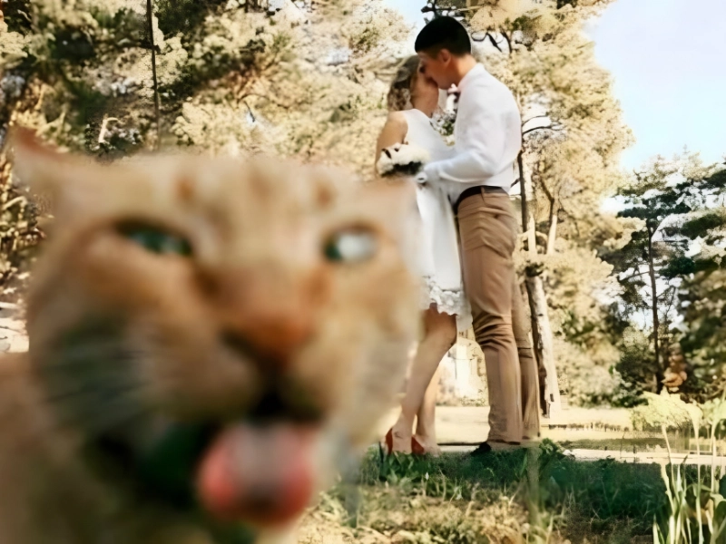 Cats are naturally inquisitive creatures, always ready to explore—even when it's not their concern! This charming picture captures a cat performing the famous "Einstein pose" while a couple in the background celebrates a memorable moment.