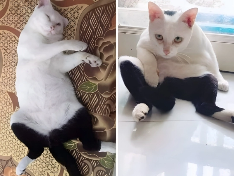 Unlike the typical random or vertical patterns observed on cats, this feline has a distinctive marking on its back that hilariously resembles baggy pants.