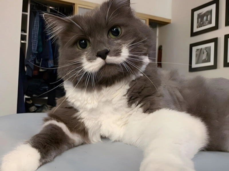 Key Features Charming Moustache: The cat's moustache, combined with its fluffy fur and gray coloring, gives it a sophisticated appearance. Imaginary Scenario: One can easily picture this classy cat sitting in a fine restaurant, enjoying an expensive glass of wine. Conclusion This gentlemanly cat brings a smile and sparks the imagination, reminding us of the charm and personality pets can display!