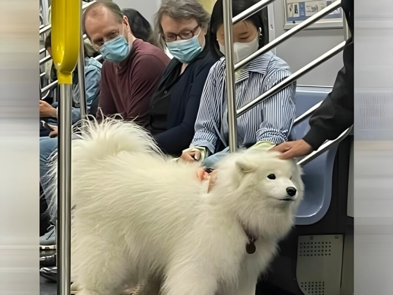 In some places, the only way to make subway rides more enjoyable is to add a fluffy dog tagging along with commuters. That's exactly what's captured in this photo. Stories suggest this dog often rides the train with people, hopping on at random stops. While we can't confirm the accuracy, the pup seems to enjoy its ride. Look closely, and you'll notice it's wearing tiny dog shoes—a thoughtful addition for hot or cold pavement. This dog's presence adds warmth to the mundane experience of commuting, reminding us that even city life has moments of joy, especially with a friendly pup by your side.