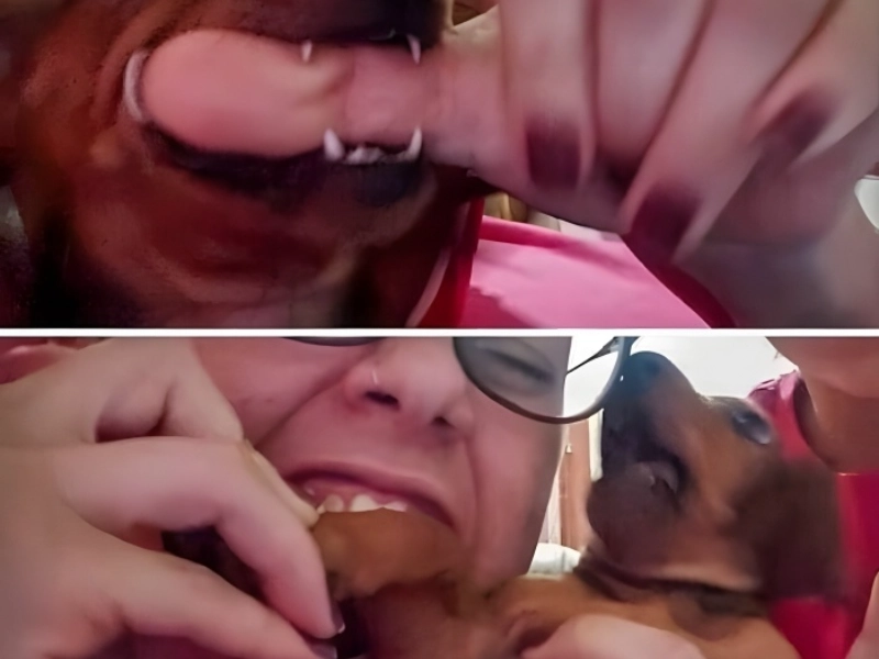 This puppy clearly wasn't expecting its owner to react the way they did. Its shocked expression in the second picture is priceless, as if it thinks someone is trying to hurt it. Moments earlier, the puppy was enthusiastically nibbling its owner's fingers, never expecting the playful bite back. While the pup's reaction is amusing, it likely learned a valuable lesson about boundaries. This humorous moment reminds us that even lighthearted interactions can lead to surprises, teaching our furry friends important lessons along the way.