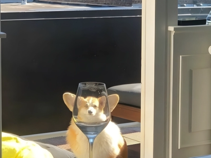 This amusing photo captures a corgi standing innocently while its owner laughs uncontrollably. The glass in the background distorts the corgi's head, creating a comical effect. While there's no real purpose to this photo other than making us laugh, it's almost creative in its simplicity. Hopefully, the corgi's confidence wasn't shaken by this moment. Dogs have their own unique charm, and silly moments like this remind us why we love them. This photo perfectly encapsulates the joy of having a pet.