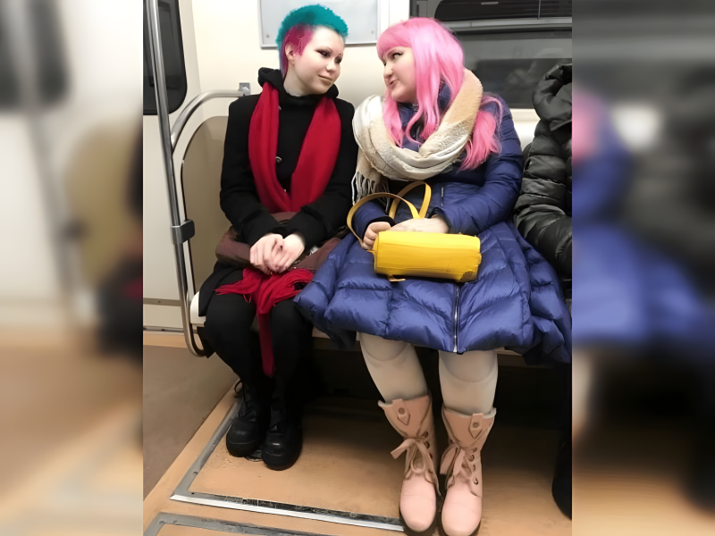 Amid the hustle and clamor, two kindred spirits connect. Their shared giggles and soft murmurs remind us that even in the most hectic spots, true bonds can spark out of nowhere.