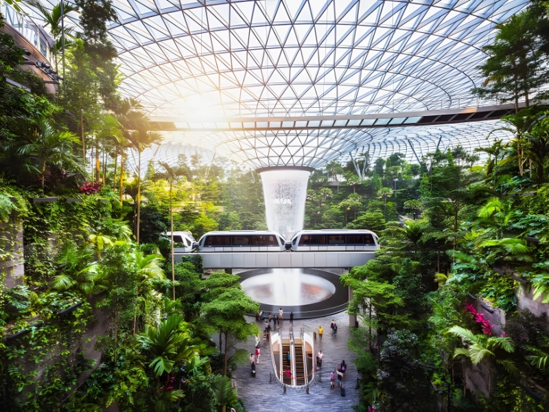 Inside Jewel, visitors can explore over 300 shops and restaurants, relax in a rooftop pool, and wander through enchanting orchid and butterfly gardens. Its centerpiece, The Rain Vortex, holds the title of the tallest indoor waterfall in the world, with rainwater cascading through a 130-foot-high opening in the roof, creating a mesmerizing spectacle.