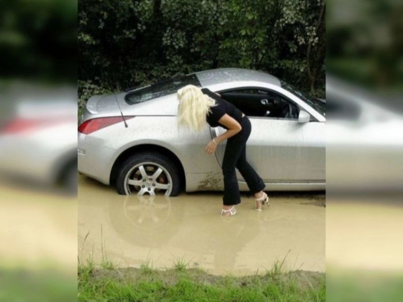 "I'm just thankful I didn't damage the car," might be the thought going through their head. This amusing snapshot captures the relief and absurdity of barely escaping disaster. It's a photo that conveys a story with a comedic angle.